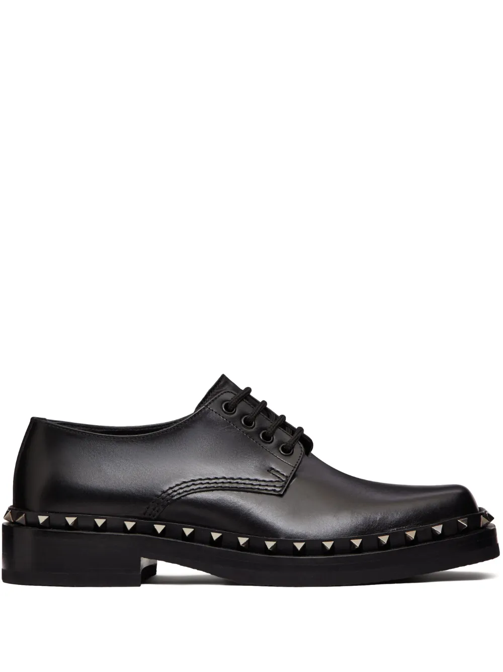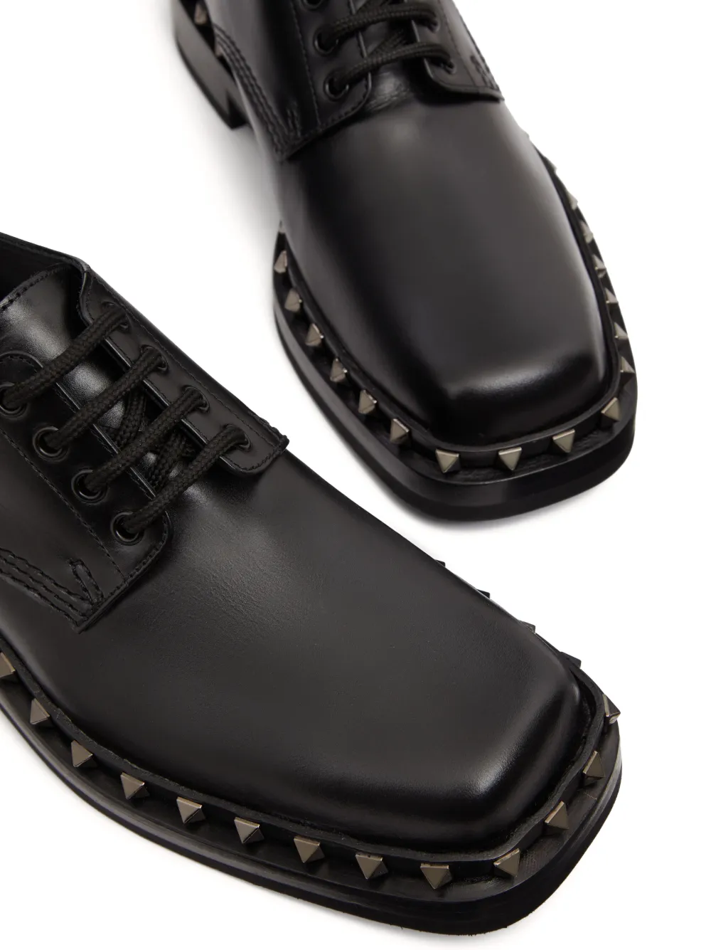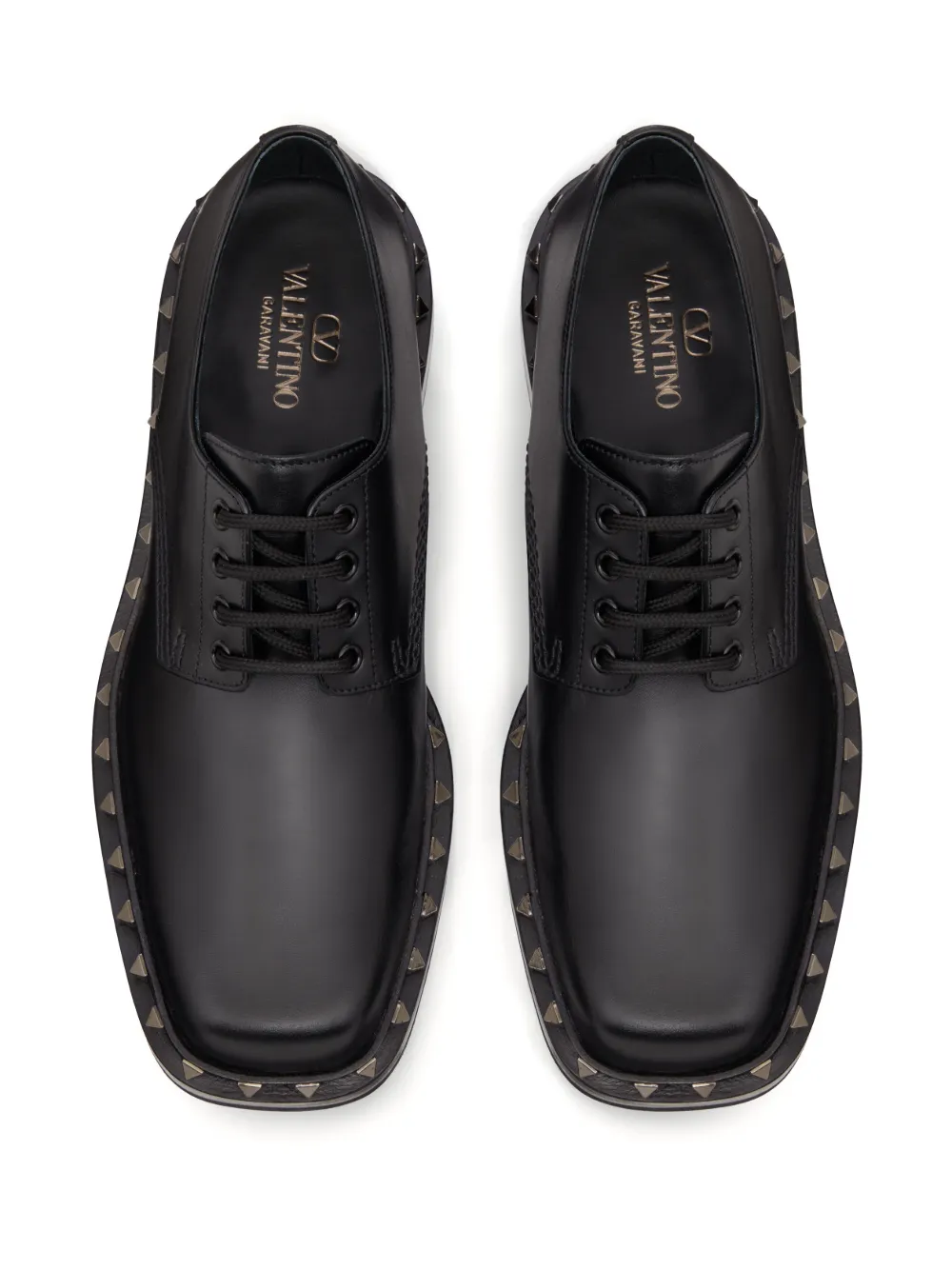 Seamlessly merging rebellion with elegance, Valentino Garavani presents these Rockstud derby shoes. Crafted from smooth black leather, they feature a sleek square toe and gold-tone stud detailing adorning the outsole.