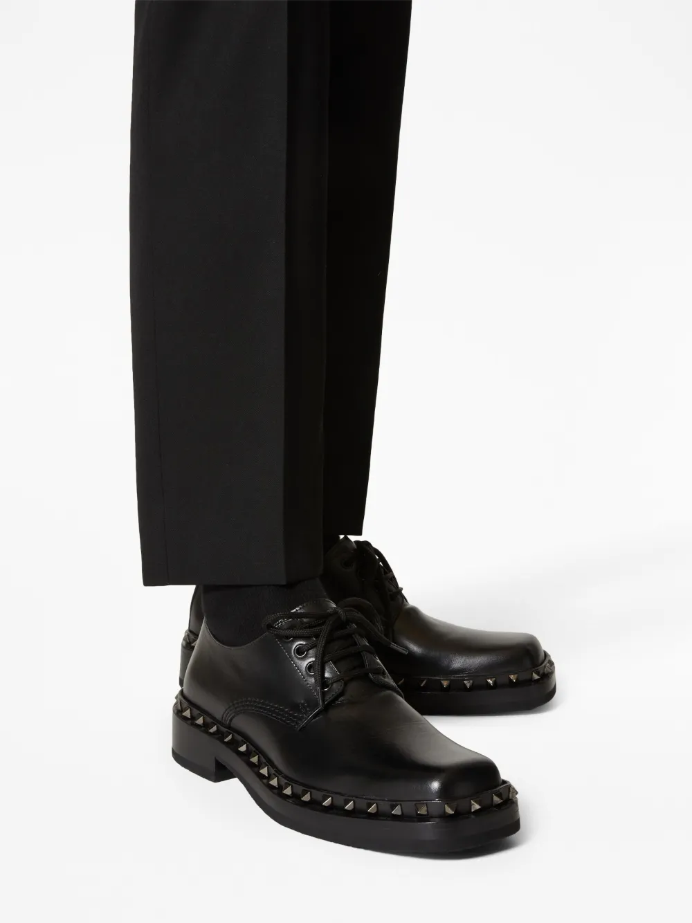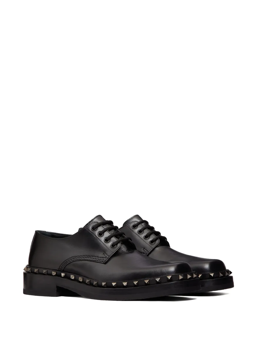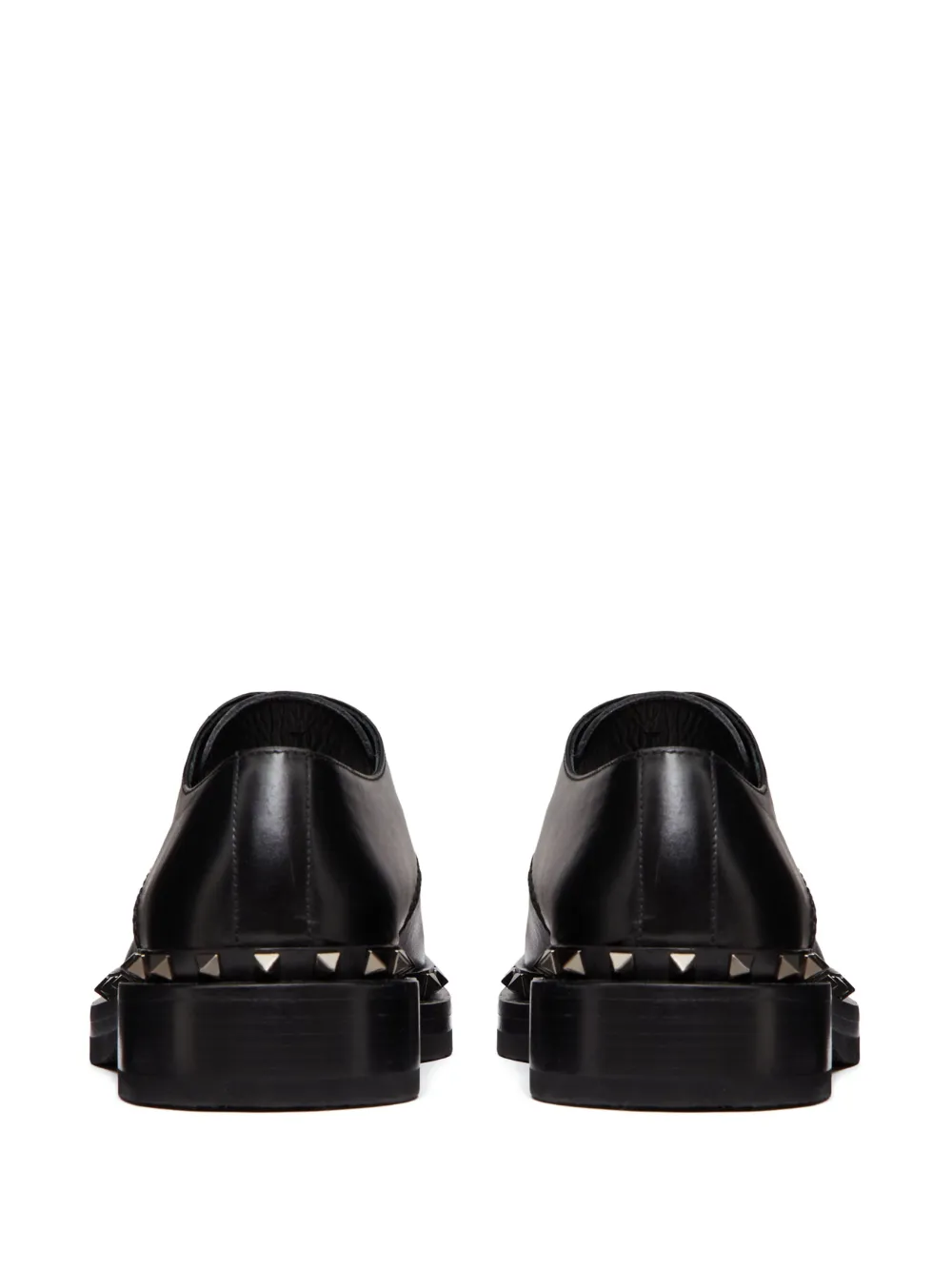 Seamlessly merging rebellion with elegance, Valentino Garavani presents these Rockstud derby shoes. Crafted from smooth black leather, they feature a sleek square toe and gold-tone stud detailing adorning the outsole.