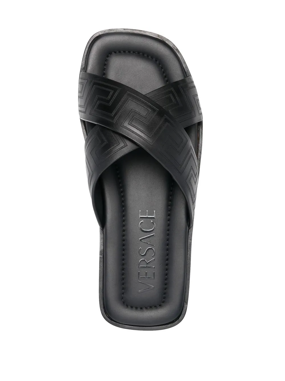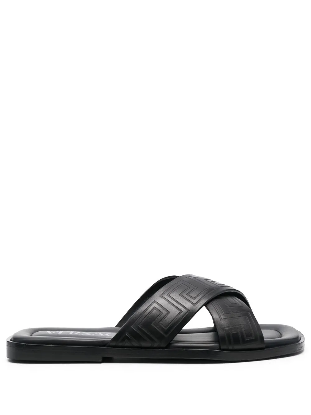 Inspired by Greek design, Versace’s Greca pattern is now a signature design of the brand. Used as a debossed pattern on the crossover straps of these slides, the shoes are instantly recognisable as the brand.