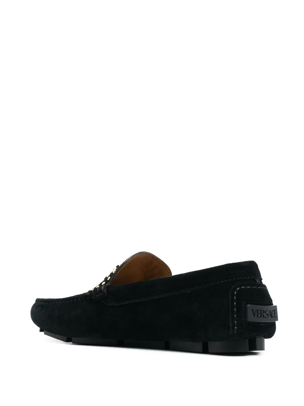 La Medusa studded suede loafer from Versace featuring black, calf leather, Medusa Head motif, stud detailing, gold-tone hardware, almond toe, branded leather insole, leather lining, branded heel counter and rubber sole.