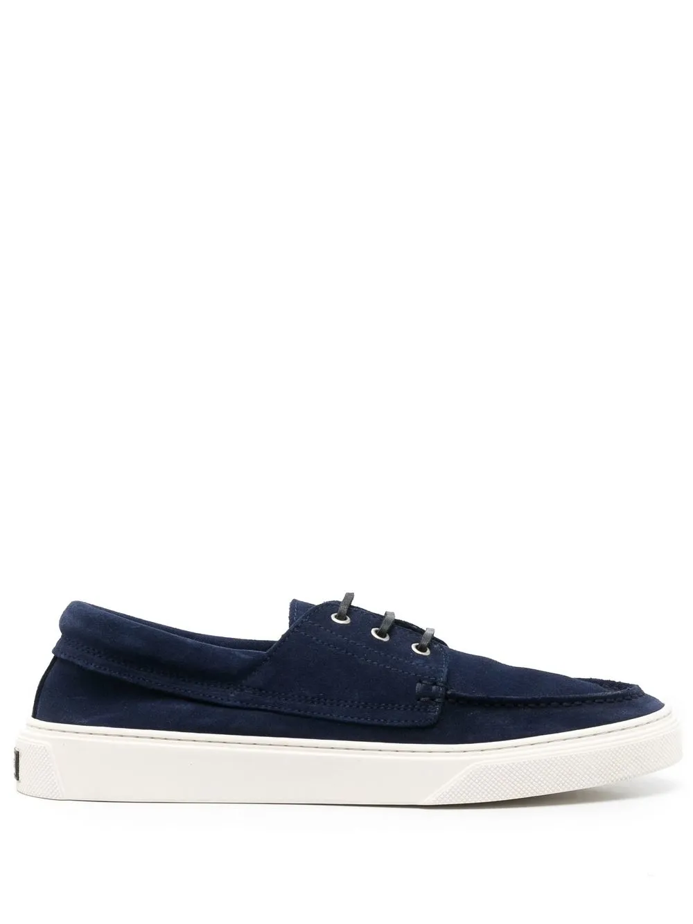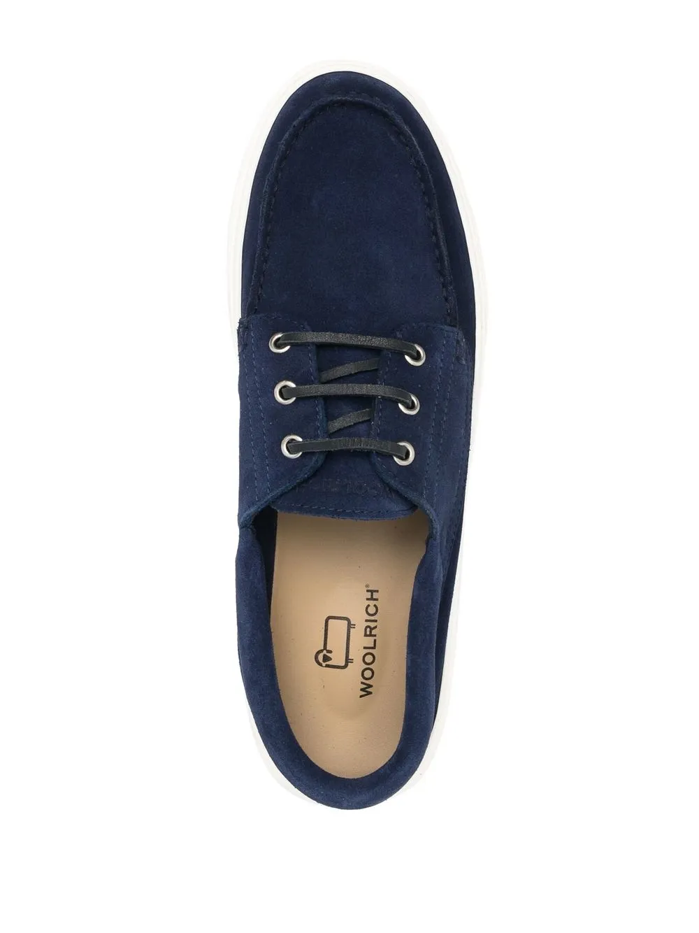 suede boat shoes from WOOLRICH featuring navy blue, calf suede, calf leather, tonal stitching, almond toe, front lace-up fastening, branded heel counter and flat rubber sole.